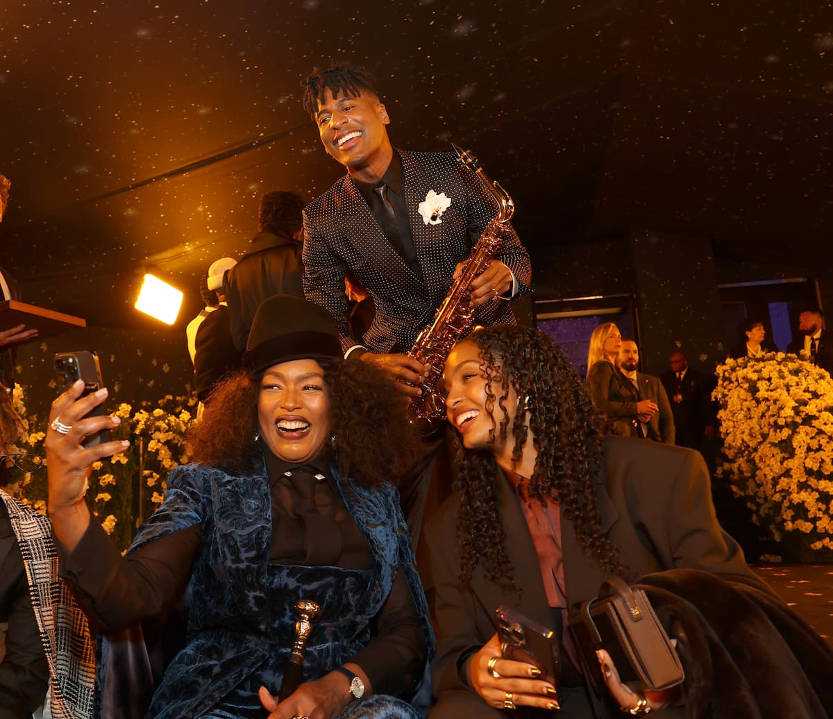 Angela Bassett y Yara Shahidi se tomaron varias selfies y Jon Batiste quiso colarse en una de ellas. No dejó ni la trompeta para hacerse la foto.