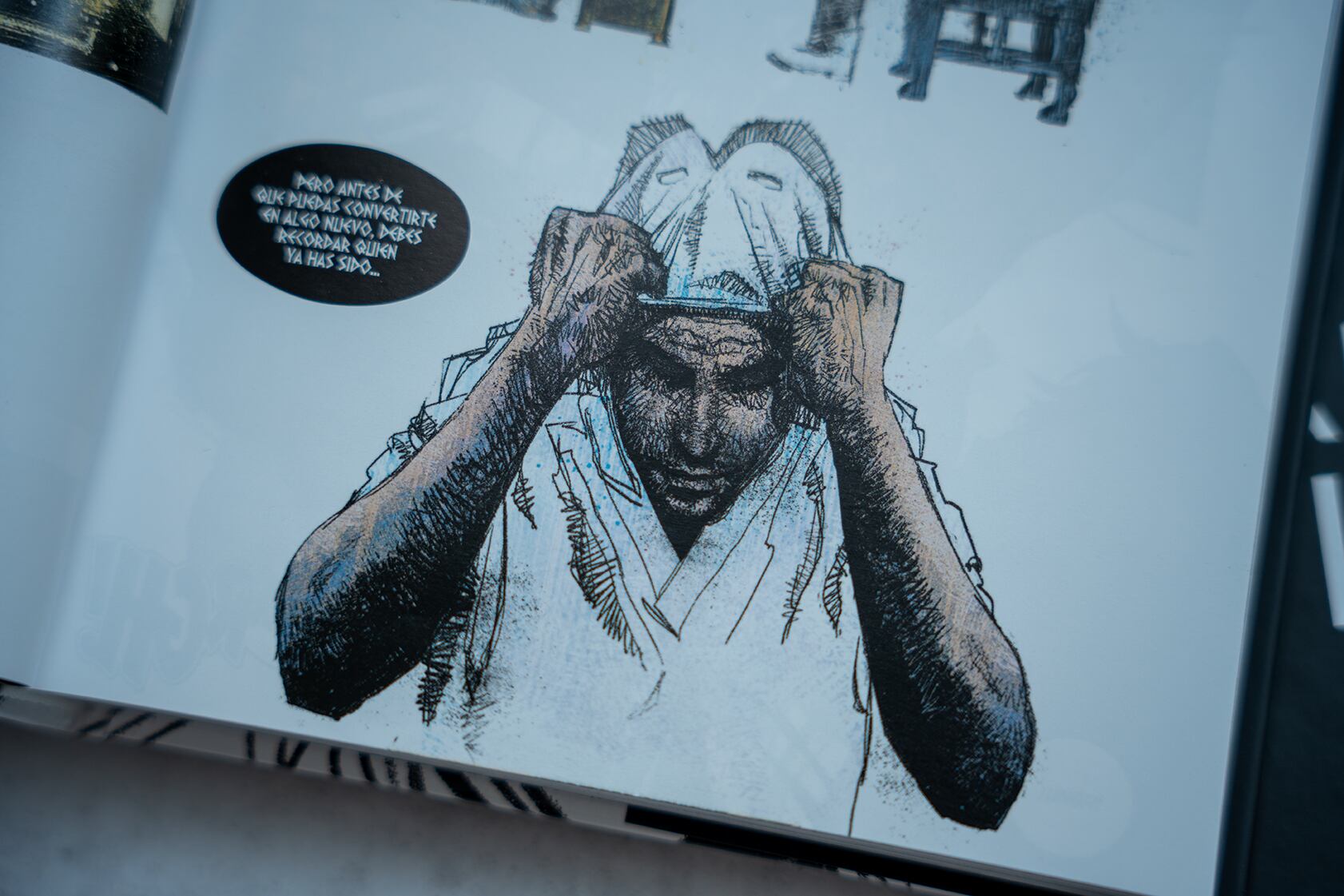 Desde ahí, Lemire y Smallwood construyen un laberinto narrativo en el que el lector, igual que Marc, no sabe qué es real y qué es ficción. Los escenarios cambian radicalmente de página a página: de la Nueva York urbana se salta a pirámides egipcias, a estaciones espaciales, a recuerdos infantiles. Cada salto refleja un quiebre mental, y el cómic se convierte en una exploración de las distintas facetas del protagonista. La acción está subordinada a la introspección, y la narrativa gráfica se pliega al desconcierto: páginas fragmentadas, viñetas rotas, bocetos sucios, superposiciones que reflejan el desmoronamiento mental del héroe... El desarrollo gráfico de esta colección es simplemente delicioso.