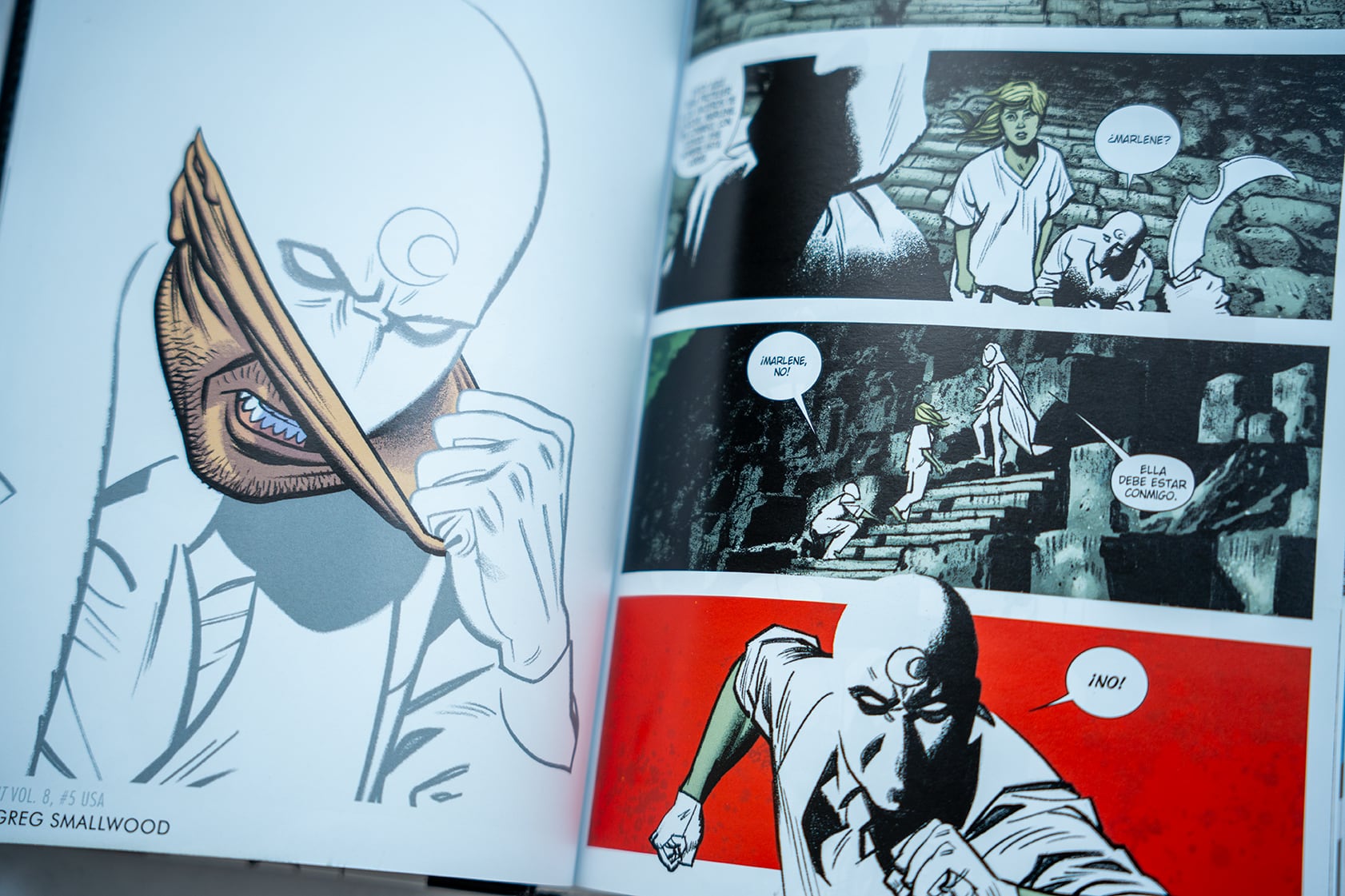 La saga comienza de forma desconcertante: Marc Spector despierta en un hospital psiquiátrico, desorientado, sedado, y sin saber si todo lo que ha vivido hasta ahora —sus identidades, sus peleas nocturnas, incluso su relación con Khonshu— ha sido un delirio. A su alrededor, enfermeros siniestros, doctores ambiguos y una atmósfera inquietante nos sumergen en un escenario que recuerda más a Alguien voló sobre el nido del cuco que a un cómic de Marvel.