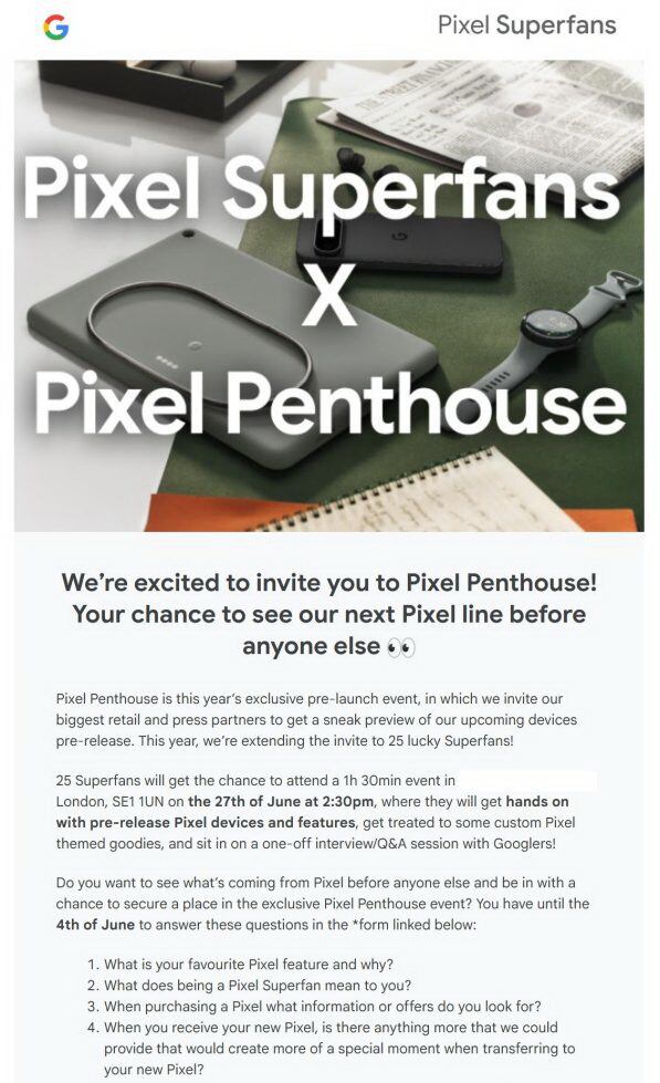 El evento tendrá lugar en Londres el 27 de junio y tendrá una duración de 90 minutos. Los superfans también tendrán la oportunidad de asistir a una sesión de preguntas y respuestas. Los invitados deberán responder algunas preguntas de Google para ver si son dignos de ser uno de los 25 Superfans que asistirán al Pixel Penthouse.