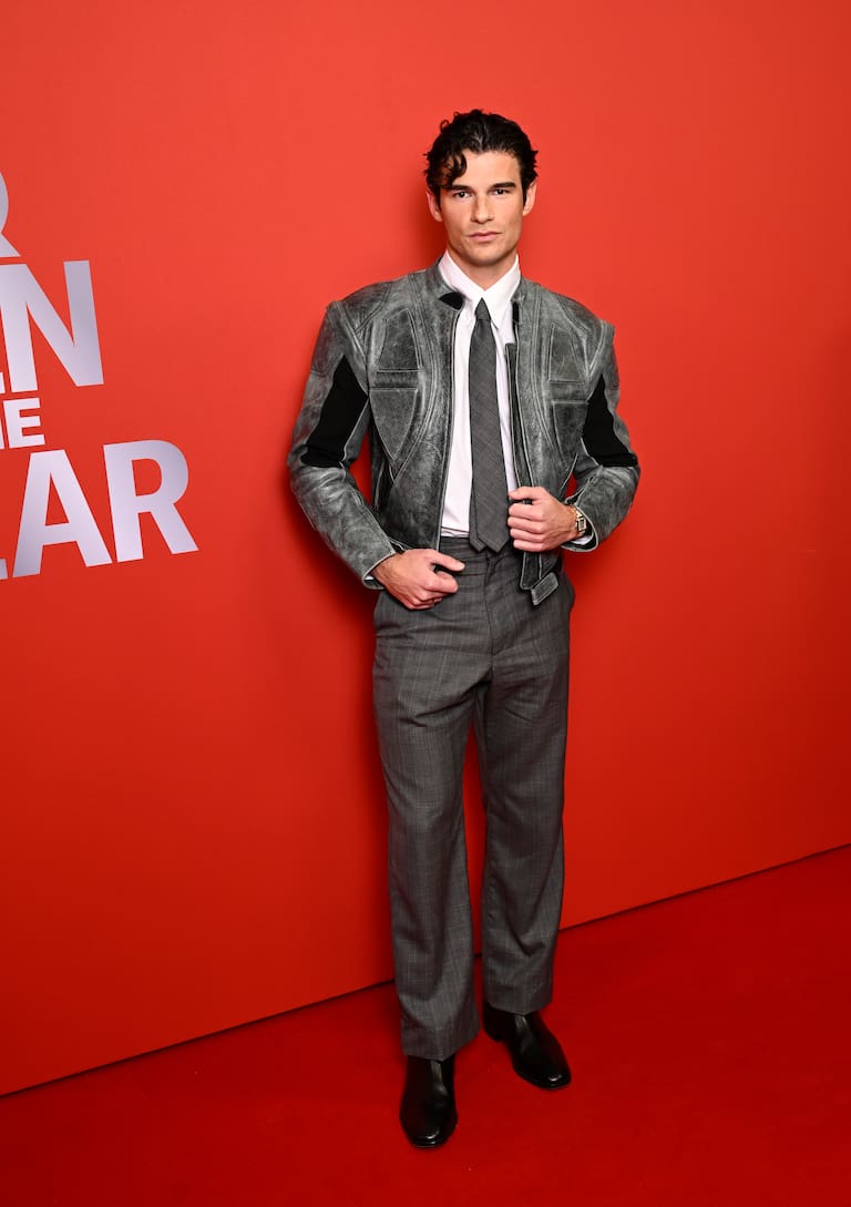 El actor de Emily in Paris ha optado por un diseño de David Koma con chaqueta de cuero de motociclista que parece sacada de un futuro utópico, corbata de lana, camisa blanca y pantalones de corte impecable.