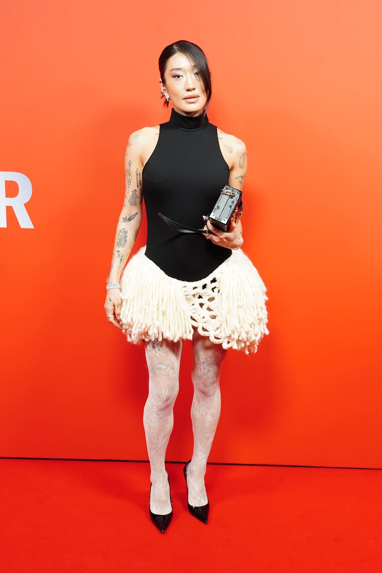 La DJ Peggy Gou, que en su día se relacionó con Arón Piper, también acudió a la fiesta con este mini vestido bicolor de falda globo y cuerpo con cuello halter.