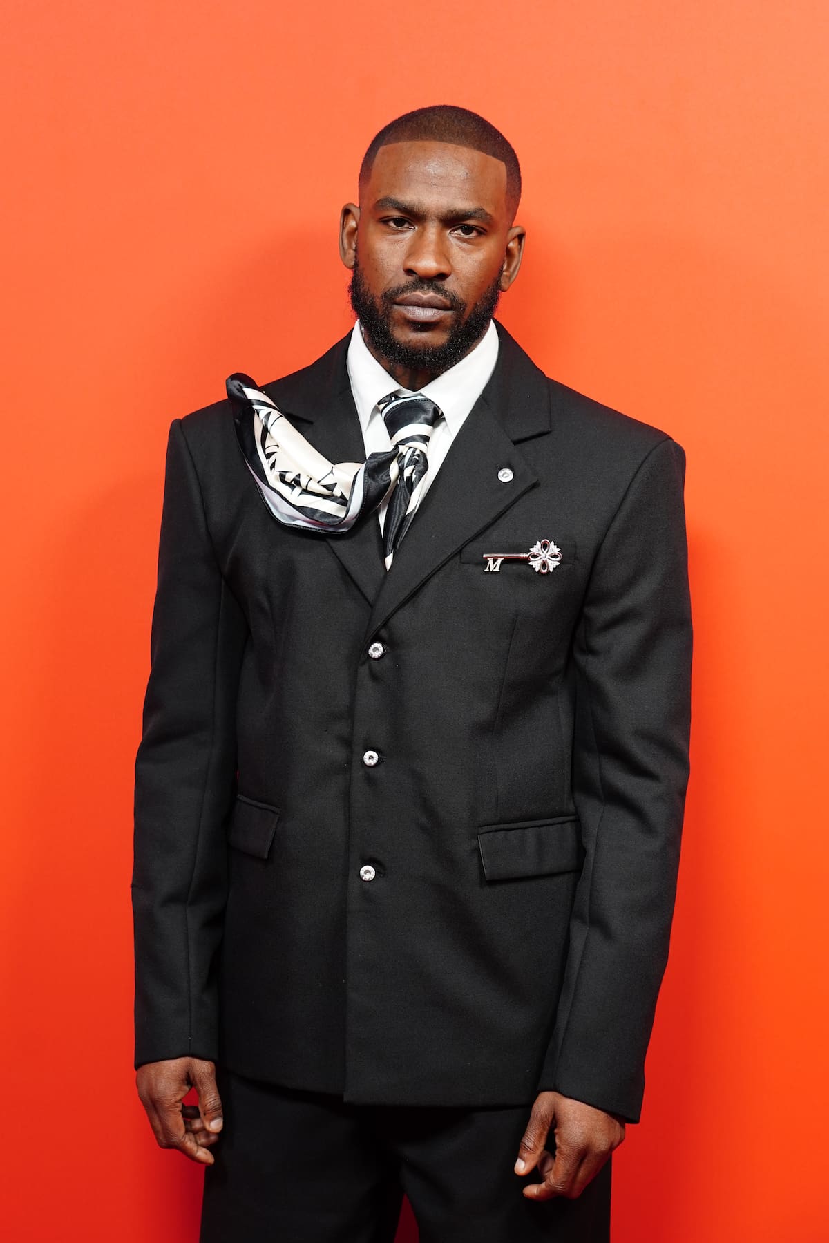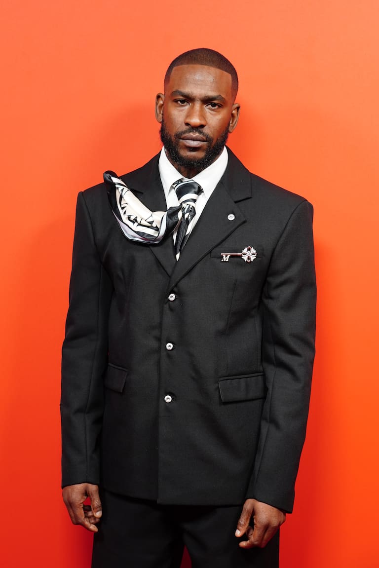 No tuvo que ir muy lejos para elegir diseñador. Skepta escogió uno de su propia firma, Mains, Si alguien piensa que es un traje sencillo es que no se ha fijado en esa silueta cuadrada, o en esa corbata doblada hacia atrás, o esos botones metálicos con tachuelas o tal vez en ese broche con forma de llave.