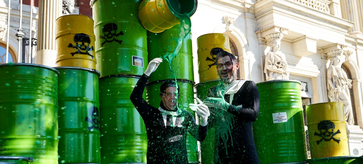 El Ministerio de Agricultura, Pesca y Alimentación fue este martes el escenario de una protesta tan simbólica como llamativa: una pirámide de barriles tóxicos, activistas disfrazados de líderes políticos y una "ducha" de pesticidas cayendo sobre réplicas de Pedro Sánchez, Ursula von der Leyen y Luis Planas. La acción, impulsada por organizaciones sociales y ecologistas, forma parte del Toxic Trade Tour, una gira europea que denuncia el acuerdo comercial entre la Unión Europea y los países del Mercosur.
