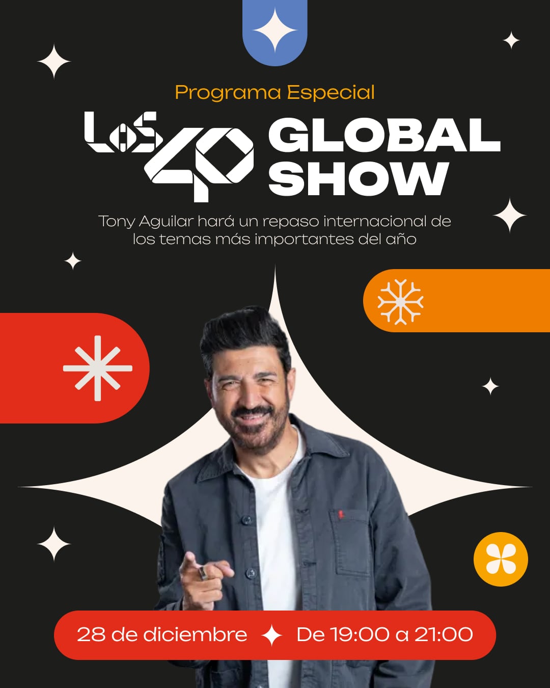 La programación especial continuará el 28 de diciembre con una edición especial de LOS40 Global Show, que se emitirá de 19:00 horas a 21:00 horas. En esta ocasión, Tony Aguilar será el encargado de conducir un recorrido internacional por los temas más importantes del año. El espacio pondrá el foco en los grandes hits globales, siendo un repaso para entender cómo ha sonado el año a nivel mundial y qué artistas y canciones han marcado la agenda musical en distintos países.