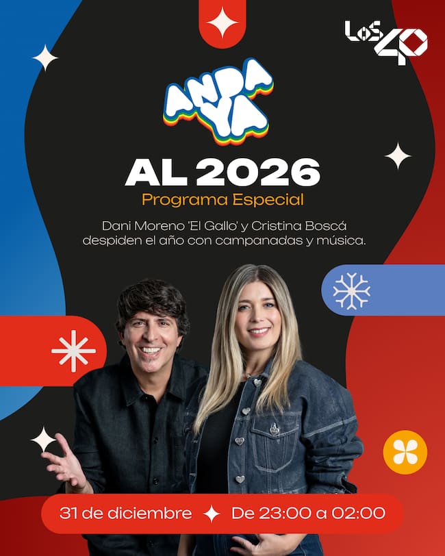 El 31 de diciembre, LOS40 despedirá el año con Anda Ya al 2026, un especial que se emitirá de 22:00 horas a 02:00 horas. Dani Moreno ‘El Gallo’ y Cristina Boscá serán los encargados de acompañar a los oyentes durante las últimas horas de 2025 y la entrada en el nuevo año. Música, ambiente festivo y las tradicionales campanadas formarán parte de una emisión pensada para quienes eligen la radio como compañía en una de las noches más señaladas del año.