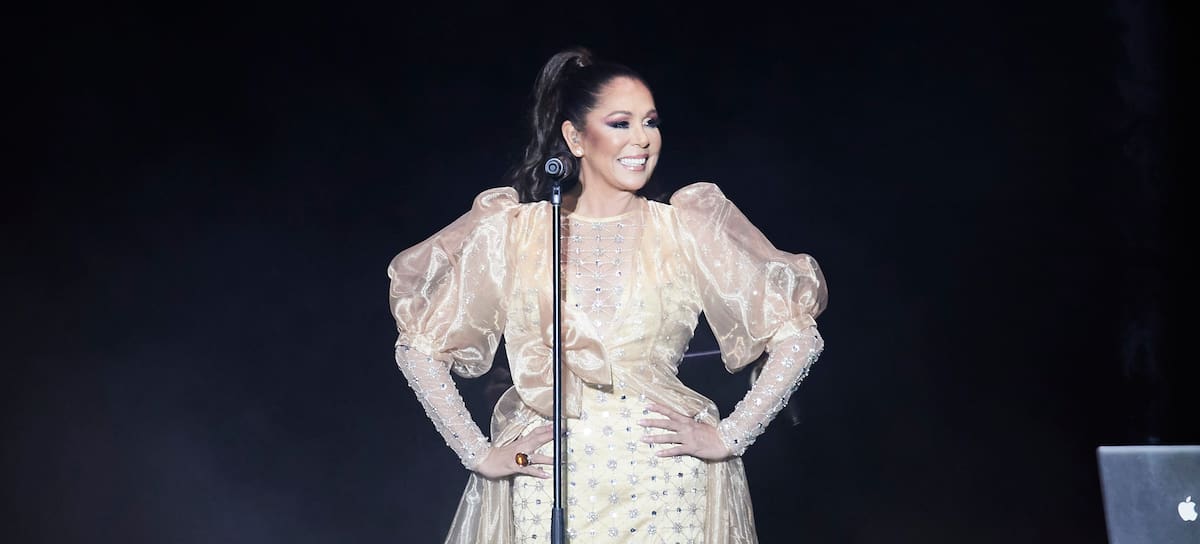 Isabel Pantoja durante su concierto en el Movistar Arena posando feliz con un vestido blanco. / Mariano Regidor