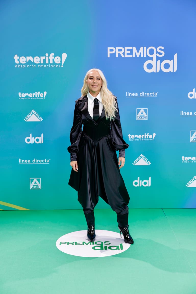 La cantante nunca defrauda con sus estilismos y en esta ocasión no iba a ser diferente. Dial celebra 30 años y había que vestir a la altura con este total look en negro de un mono con apariencia de vestido y forma de chaqueta con solapas. Contrastaba con su larga melena rubia, casi alvina.