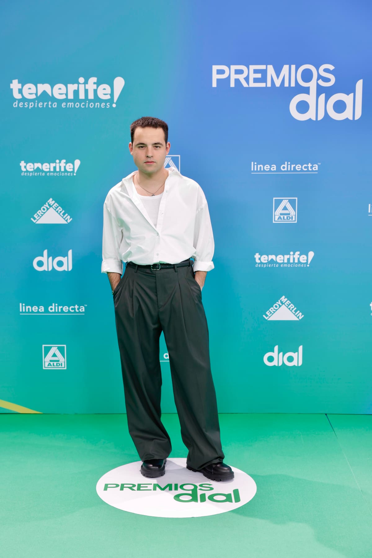 DePol ha aposado por pantalón oversize gris con camisa blanca abierta y remangada. “Es mi primer premio, estoy muy contento y se lo dedico a toda la gente que me ha aguantado desde que agarré la primera guitarra e hice mi primera actuación”, decía en su paso por la alfombra verde.