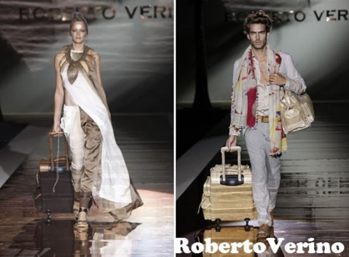VIERNES: La creatividad de ROBERTO VERINO se basa en la estética viajera con tejidos rígidos, como el `tweed' nacarado, enfrentados a otros de gran fluidez, como la gasa de seda elegida para la confección de túnicas. Después, con `Paraíso', el punto tejido a mano se combina con cuero envejecido, con una imagen más desenfadada. Para terminar, `Noches de hotel', en las que el negro y oro se fusionan en prendas con cortes en relieve nos presentan la visión más sensual y elegante de este creador.
