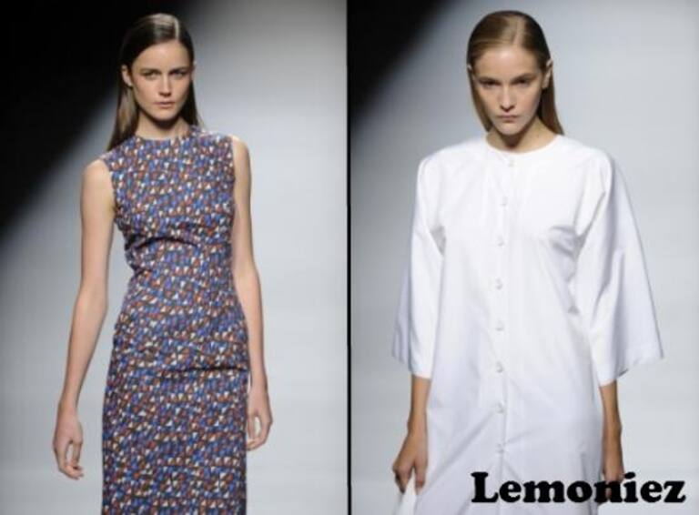 DOMINGO: Sofisticación, seducción e intemporalidad. LEMONIEZ presenta una colección de lo más retrospectiva y con aires navy que se hacen realidad en los tejidos impermeables y los colores azul y blanco que tan bien sientan en verano. Vestidos de trompe-l'oeil en popelín blanco, con tweeds de algodón en abrigos, vestidos y faldas. Pero también jerseys de algodón en líneas ajustadas que dan paso a los estampados geométricos multicolores de inspiración retro.