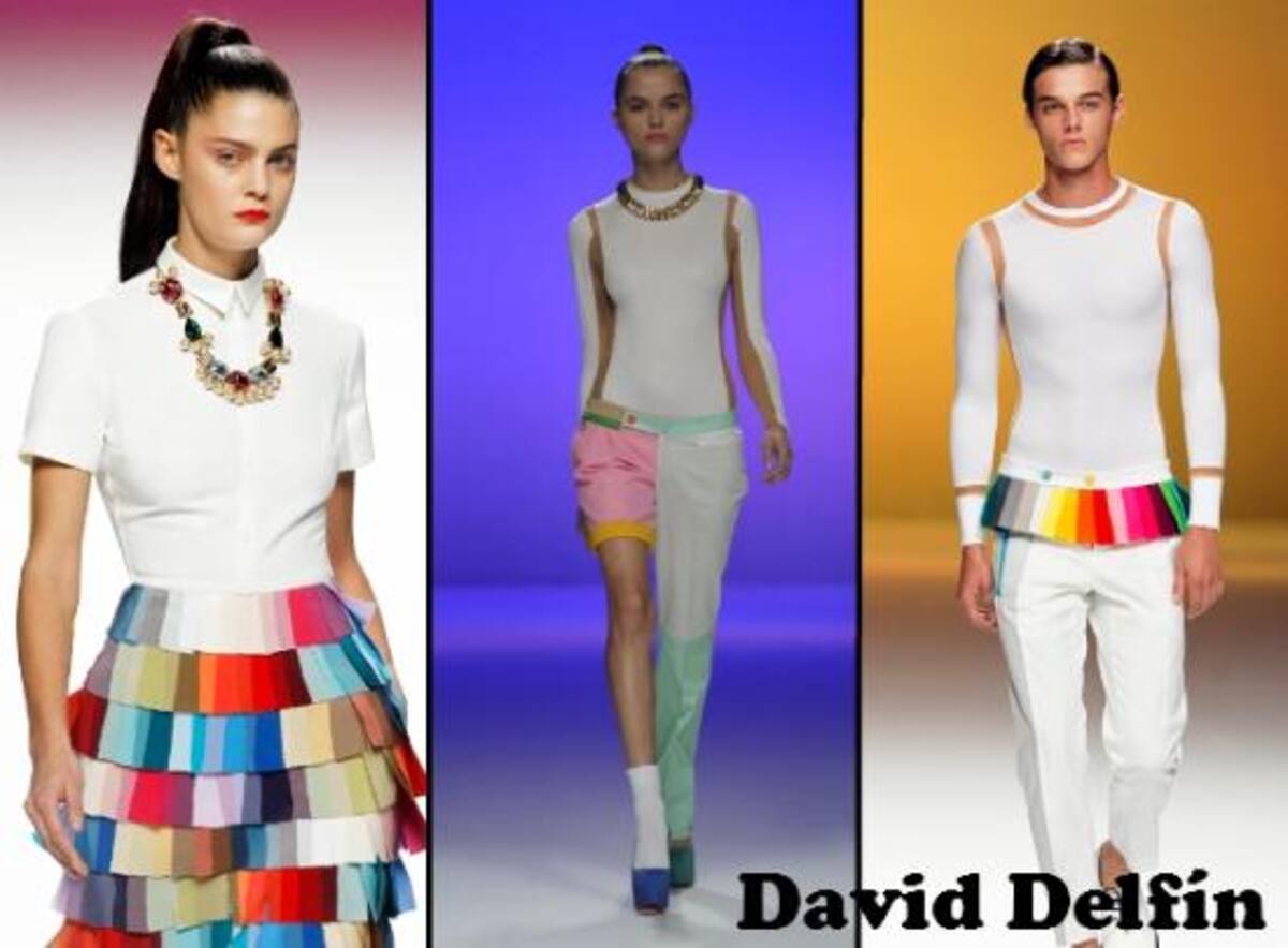 SABADO: Toda la colección de DAVID DELFIN tiene una base en blanco luminoso y la explosión de color inunda los detalles y las aplicaciones. Cada costura y cada cremallera son un lienzo para pintar rojos, amarillos, azules y verdes. En otros casos cose a la ropa las banderas de tejidos y las cartas de colores haciendo un arco iris multicolor. Tejidos de algodón, seda y poliester dejan paso a otros como el piqué de algodón, el que se usa para la ropa de los bebés.