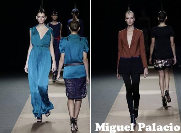 VIERNES: Como punto y final de la primera jornada de desfiles, MIGUEL PALACIO presentó una colección en la rica en detalles, formas, cortes y contrastes, cuya principal objetivo es crear un universo creativo muy personal. La mujer propuesta por Palacio es muy femenina y apuesta por diseños con calados y aberturas muy pronunciadas en las faldas. En general, un patronaje muy ceñido, que pone su mayor énfasis en definir bien las cinturas, pero que deja los volúmenes realzados para los hombros.