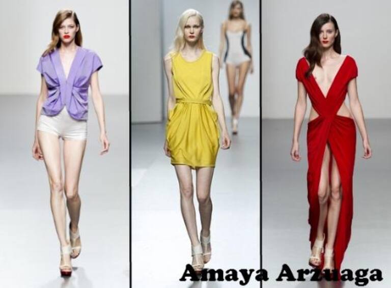 DOMINGO: La diseñadora burgalesa AMAYA ARZUAGA presentó su colección más juvenil de la mano de la línea AA. Los diseños de la creadora son una mezcla de materiales con grandes plisados con los que consigue amplios volúmenes que combina con piezas lisas. Ha apostado por acortar los largos de las faldas y vestidos, vistiendo a una mujer sensual y femenina.