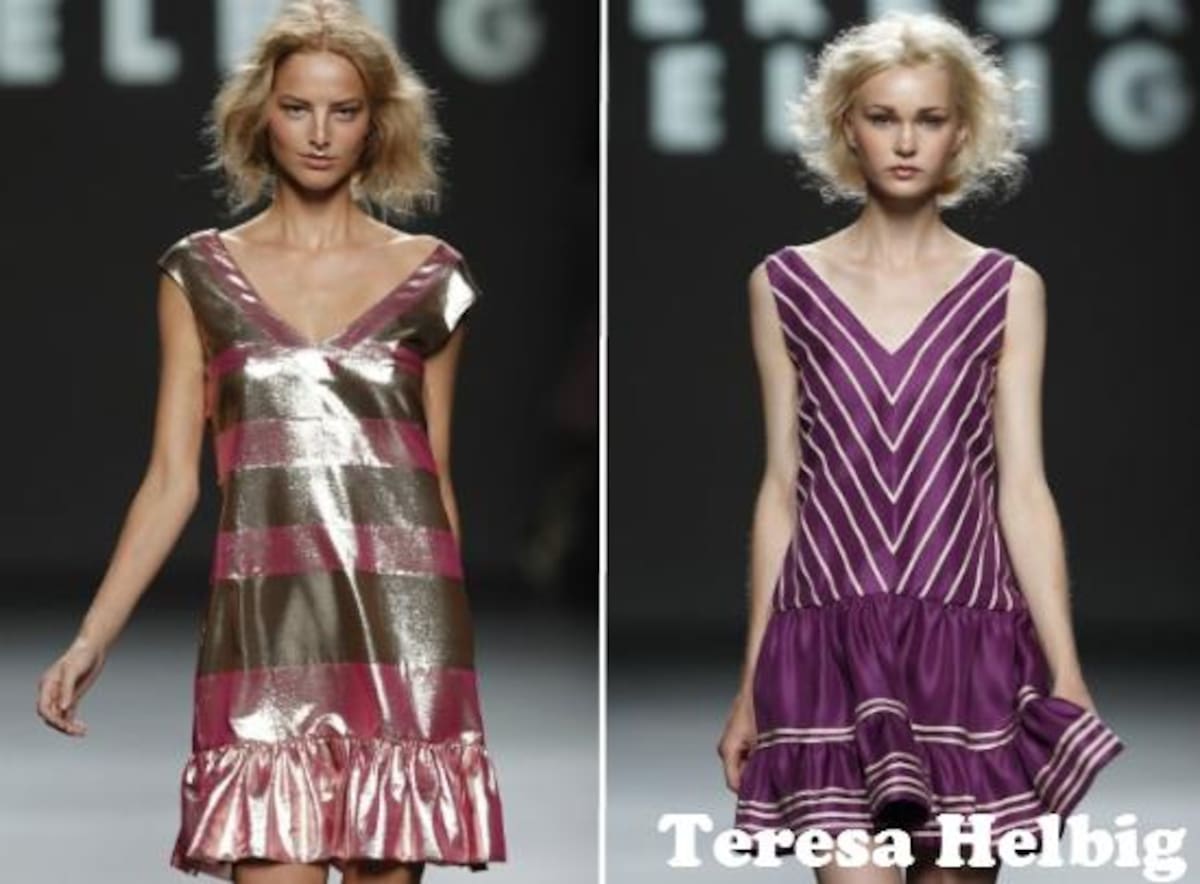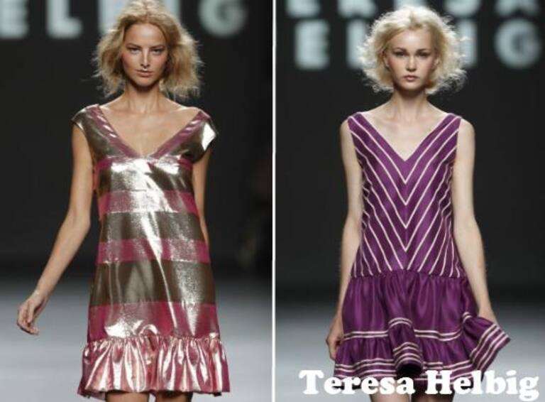 SABADO: TERESA HELBIG apuesta por vestidos femeninos, aparentemente sencillos pero muy bien diseñados y cortados, favorecedores con todo tipo de cuerpos y figuras. Energía, metalizados y rosas combinados a la perfección. Rayas anchas decoraban vestidos y tops, mientras que las piernas lucían en todo su esplendor con breves mini shorts.