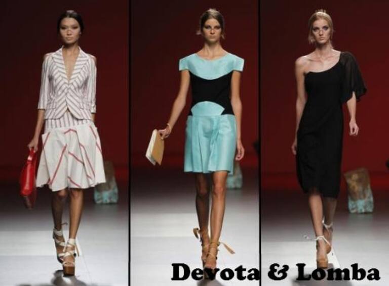 SABADO: DEVOTA & LOMBA apuesta por formas orga'nicas y geome'tricas en tejidos texturizados y naturales, de fibras vegetales que imprimen ligereza y transparencia, las lineas siguen al cuerpo o toman cara'cter de adorno y si'mbolo de jerarqui'a. La manera rudimentaria y severa de emplear el color, negro, rojo coral, azul maya, verde jade, amarillos y ocres, tierras y blancos recuerdan sus rituales y las pinturas en cuerpos semidesnudos trasladados al presente.
