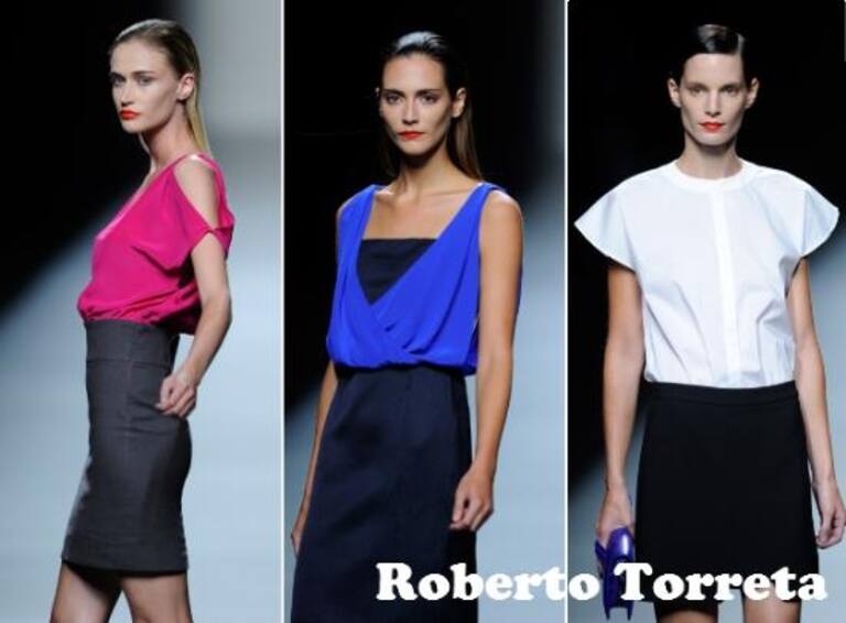 SABADO: Perfecta, de apariencia sencilla pero trabajada con esmero y talento. La colección de ROBERTO TORRETA tiene colores sobrios, ricos tejidos y detalles de costura. Su paleta cromática navega entre negro, grises, berengena, azul klein y el blanco. Este color se adueña de la colección, combinando con otros o en look total. Chaqueta, camiseta y falda tienen diferentes largos, y se superponen, una idea que se repite en la colección. La línea es muy pura, casi recta.