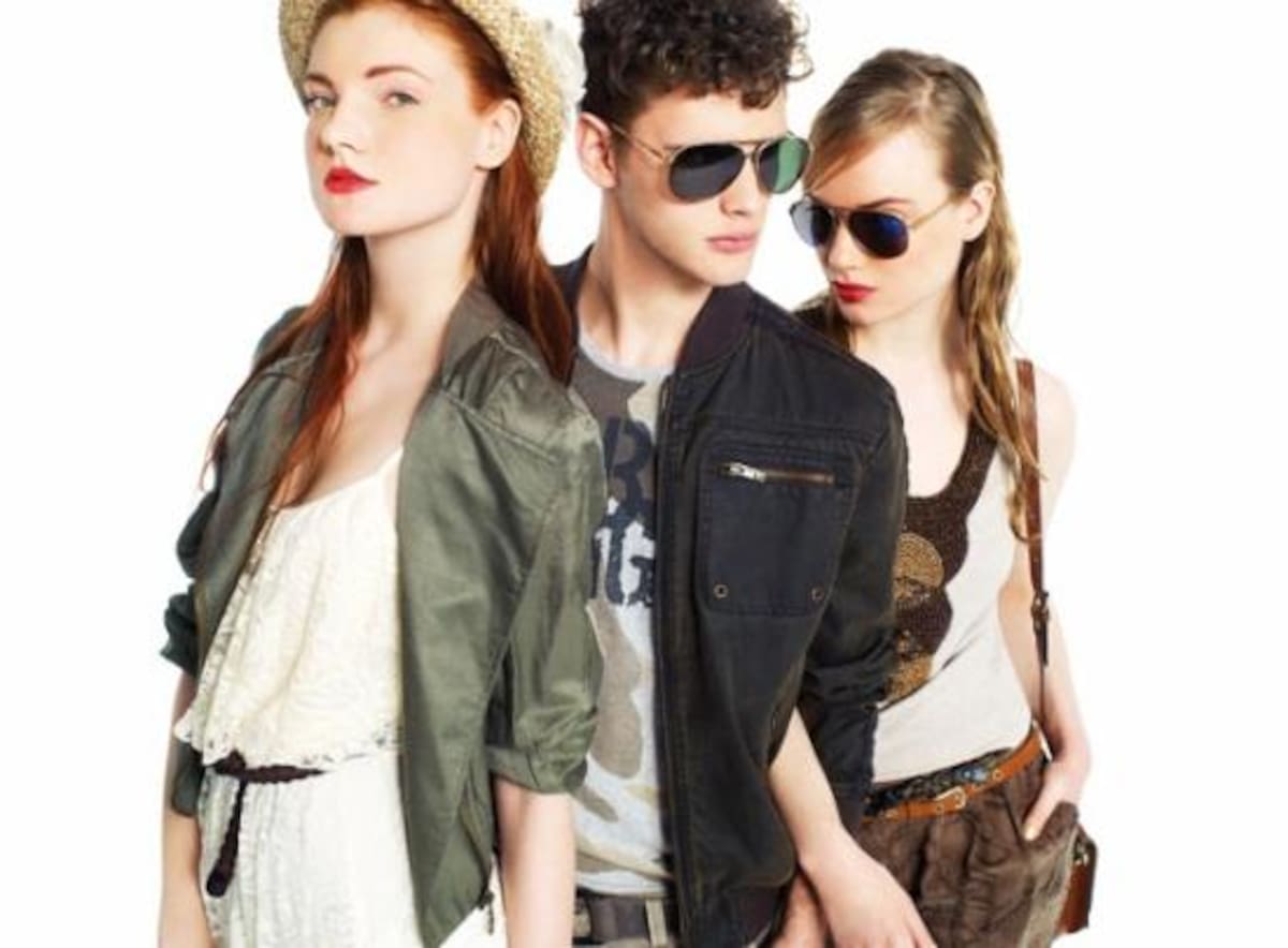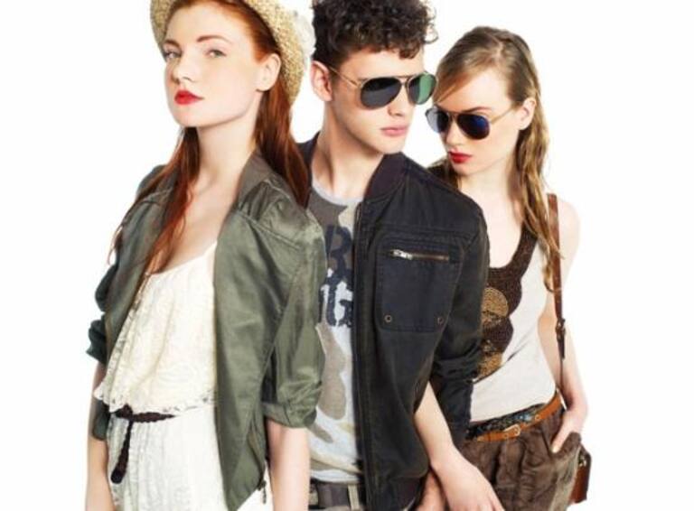 Tendencia Tribal. La primera modelo lleva un vestido de encaje asimétrico de Fórmula Joven (45,95 ?) y cazadora de Green Coast (45,95 ?). El chico lleva cazadora de Green Coast (69,95 ?) y camiseta de Fórmula Joven (17,95 ?) con pantalón corto de Green Coast (39,95 ?). La tercera modelo lleva camiseta con aplicaciones de Studio Classic (24,95 ?) y pantalón de Easy Wear, (39,95 ?)