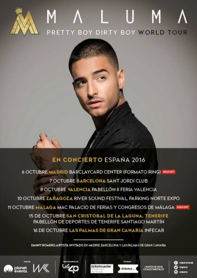 Maluma arranca esta semana su primera gira en España: Pretty Boy Dirty Boy, que también da título a su segundo álbum. Los conciertos tendrán lugar este jueves 6 de octubre en el Barclaycard Center (Formato Ring) de Madrid, el 7 en el Sant Jordi Club de Barcelona, el 8 en Pabellón 8 Feria de Valencia, el 10 en el River Sound Festival (escenario del Parking Norte Expo) en Zaragoza, el 11 en el MAC Palacio de Ferias y Congresos de Málaga, el 15 en el Pabellón de Deportes de Tenerife Santiago Martín, San Cristóbal de la Laguna, Tenerife y el 16 en Infecar de Las Palmas de Gran Canaria.