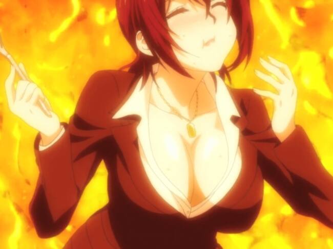 Hay una escena brutal en el primer episodio en la que Soma conquista a una mujer con un plato vegetariano. La historia es que ella intenta que dejen el local para poder edificar en la zona, pero "se lo juegan" todo a un plato (como no podría ser de otro modo en un anime de cocineros). Ella hace desaparecer toda la carne del restaurante para pedir un asado y dejar así a Soma en jaque. Cuando Soma se saca un plato de carne "sin carne" de la manga la mujer implosiona de gusto y ¡mec! aquí tenéis...