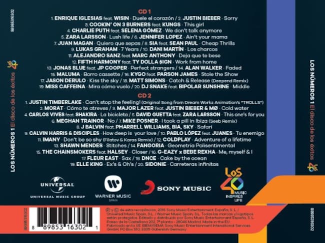 Un hit tras hit en el que no faltan las canciones que más hemos coreado y bailado los últimos meses así como otros temas del momento. En esta nueva edición de Los Números 1 de LOS40 podrás encontrar canciones que han llegado a lo más alto, desde el pelotazo veraniego de La Bicicleta de Carlos Vives y Shakira hasta el hit Closer de The Chainsmokers y Halsey o We don't talk anymore de Charlie Puth y Selena Gomez.