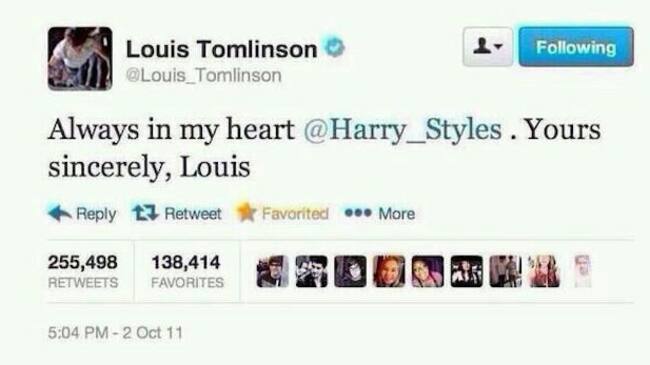 El 1 de diciembre de 1976, cuatro chavales apenas conocidos, con peinados insólitos e imperdibles fueron entrevistados en televisión y, en solo dos minutos, dijeron tres veces “fuck”, palabra maldita por aquellos tiempos. Y se armó la mundial. Los Sex Pistols ya eran el grupo más salvaje del planeta. El 3 de octubre de 2011, Louis Tomlinson, miembro de One Direction, confesó en Twitter: “Siempre te llevaré en mi corazón @Harry_ Styles” y más de dos millones de personas lo retuitearon, convirtiéndose en uno de los mensajes más leídos de la historia de la aplicación.