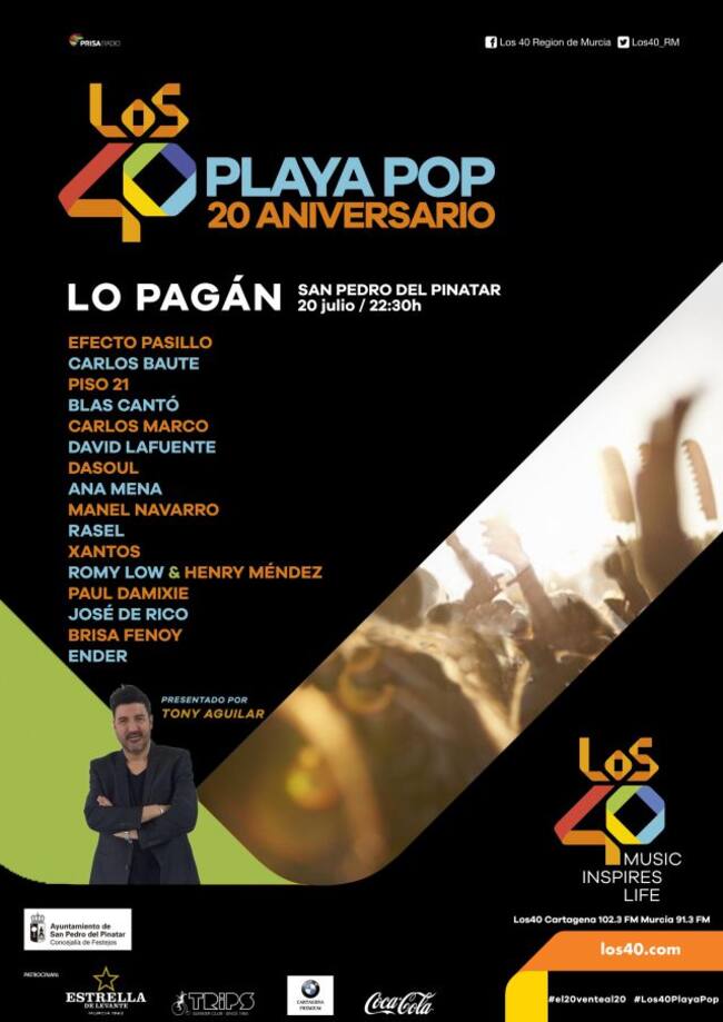 LOS40 Playa Pop se celebra, con el patrocinio del Ayuntamiento de San Pedro del Pinatar, el jueves 20 de julio a las 22,30 horas en la explanada de la curva de Lo Pagán, con entrada libre y gratuita hasta completar aforo.