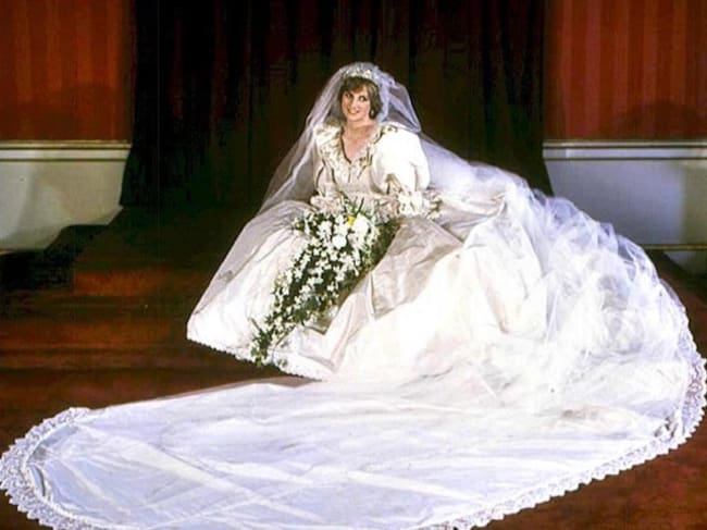 Uno de los vestidos más recordados es el que lució en su boda, diseñado por David y Elizabeth Emanuel con mangas abullonadas, inspiración victoriana, más de diez mil perlas bordadas y una cola casi ocho metros de largo.