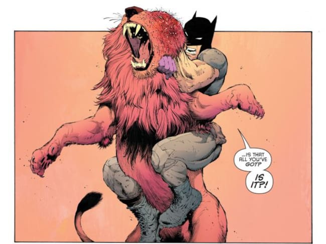 No hablamos de un paréntesis como un descanso del equipo, hablamos de un cambio de dirección en sus historias. Después de la oscuridad de “Los Búhos”, “La Muerte de la Familia” y “Ciudad Secreta”, trajo consigo también un nuevo enfoque artístico que buscaba algo de atrevimiento con la paleta de colores. Aprovechando el “flash-back” que proponía la historia, un comienzo desconocido con un Bruce Wayne más inexperto y la peculiar personalidad del villano elegido; Snyder y Capullo se sacaron de la manga una historia refrescante, una historia en la que Batman va en una moto de Trial con guantes morados y llega a pelear mano a mano contra un león; un nuevo comienzo y sobretodo un enfoque diferente para el aspecto visual.
