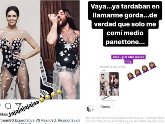 Todo empezaba con esta foto en la que un hombre parodiaba su vestido de Nochevieja del año pasado. Ella se lo tomó con gracia y compartió en su stories una captura de pantalla para demostrar que tiene un gran sentido del humor.