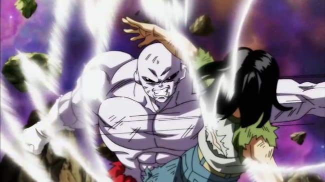 Con Jiren agotado por la lucha anterior, los golpes del equipo del Universo 7 ya empiezan a hacer mella en él, con Goku levantándose a duras penas y uniéndose a ellos.
