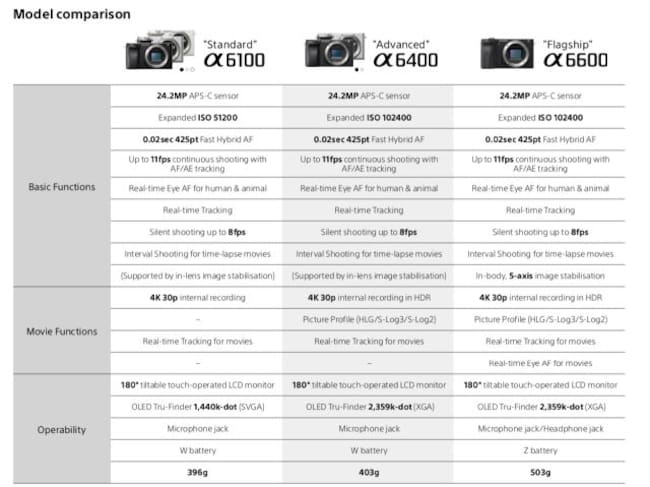 La pequeña de la familia, a6100, por su parte, pierde sensibilidad en el sensor (la ISO cae a 51200) lo que se traducirá en peor video en condiciones de poca luz. Pierde también la grabación en HDR y pierde también los formatos logarítmicos para grabar video. Tampoco tiene estabilización de imagen IBIS y tiene la batería W, la pequeña, como la a6400.