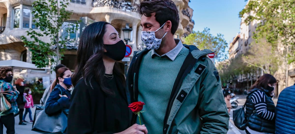 Un parella passeja per Passeig de Gràcia de Barcelona durant la Diada de Sant Jordi del 2021. / Miquel Benitez (Getty Images)