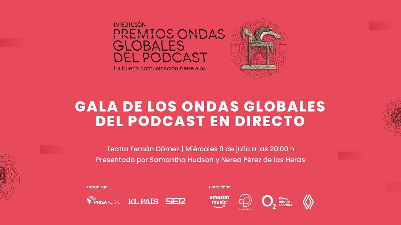 Este miércoles, 9 de julio, se celebra la cuarta edición de los Premios Ondas Globales del Podcast en el Teatro Fernán Gómez de Madrid. Una ceremonia que cuenta con dos presentadoras de lujo: Nerea Pérez de las Heras y Samantha Hudson. Con guion de Laura Márquez y actuaciones de Xoel López y Ángeles Toledano, esta cita celebrará un año más lo mejor del audio en español. Unos premios donde rostros tan conocidos como Laura Escanes, Jordi Wild o Miguel Maldonado han sido reconocidos.